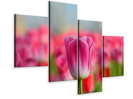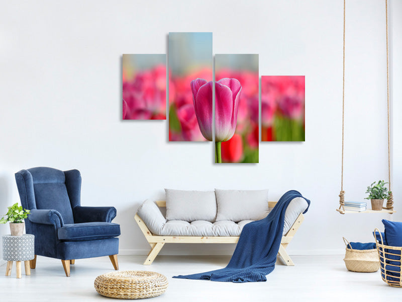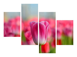 Leinwandbild 4-teilig modern Tulpenfeld in rosa-rot